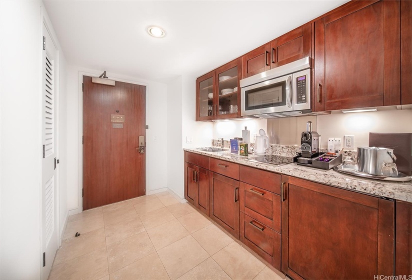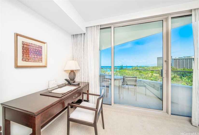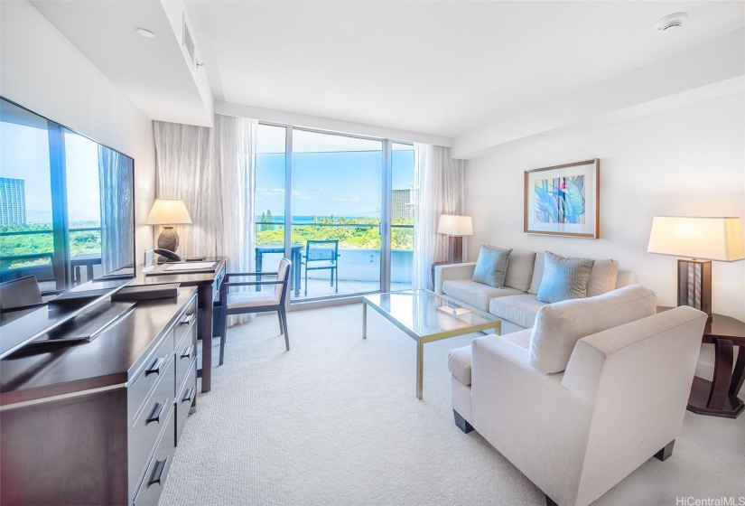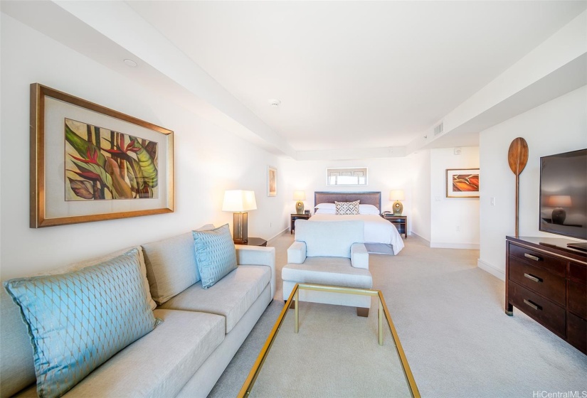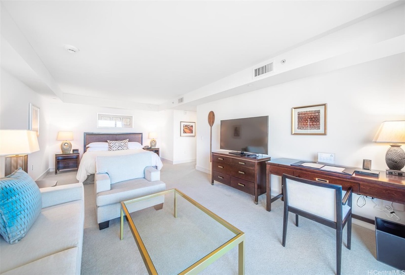 Desired Fort DeRussy Beach Park side spacious studio with full bathroom with soaking tub, double sink, and full kitchen at a luxury resort-style hotel condominium in world famous Waikiki. Minutes from Waikiki beach, various restaurants, and shops. Unit comes fully furnished including kitchenware, with sleeper sofa to accommodate extra guests. From its lanai, you will enjoy beautiful coastline and sunset views. Owner receives hotel services such as in-room dining, valet parking, concierge, and housekeeping upon request (service fees may apply). Amenities include swimming pool, fitness center, spa, bar, and restaurants.