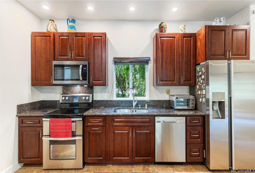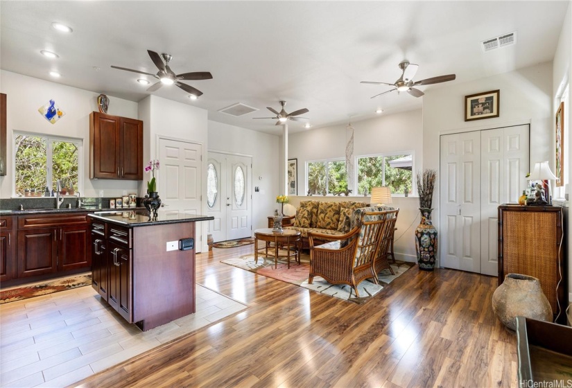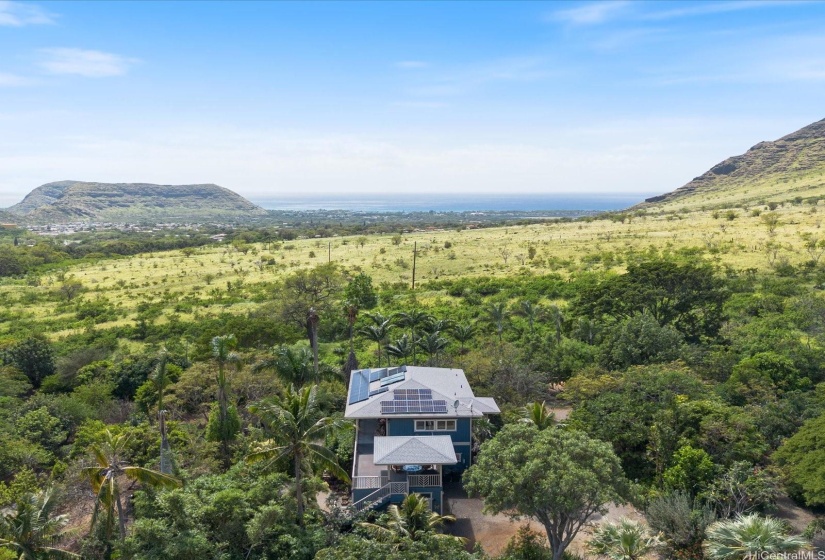 SELLERS NEED TO SELL! BRING YOUR BEST OFFER! Welcome to Mt. Ka’ala Ulu-lani! Nestled within the largest private collection of rare plants in Hawai’i, this custom-built 2200 sqft home offers energy-efficient luxury and tranquility with 32 owned solar panels and a 10 kW battery backup. Enjoy the upstairs gourmet kitchen, living room, and primary bedroom with walk-in closet and stunning bathroom. Downstairs, a spacious TV room with full kitchen, large guest room and bath, office, and a Solar Inverter & Battery Room. This home has 9-foot ceilings, Pella double-pane windows, and custom window treatments, comfort and style abound. The 2+ car air-conditioned garage boasts a 600 sq. foot deck with a gazebo and half bath. The property spans just shy of 4 acres, offering breathtaking views of Mt. Ka’ala and the ocean. Explore the well-defined areas including a meditation garden, fruit tree grove, tropical rainforest, sunken garden with a koi pond, and a flowering tree garden. With a solar-powered electric gate, irrigation system, and Arlo camera system, convenience and security are paramount. Furniture, all lawn and garden equipment and golf cart INCLUDED!