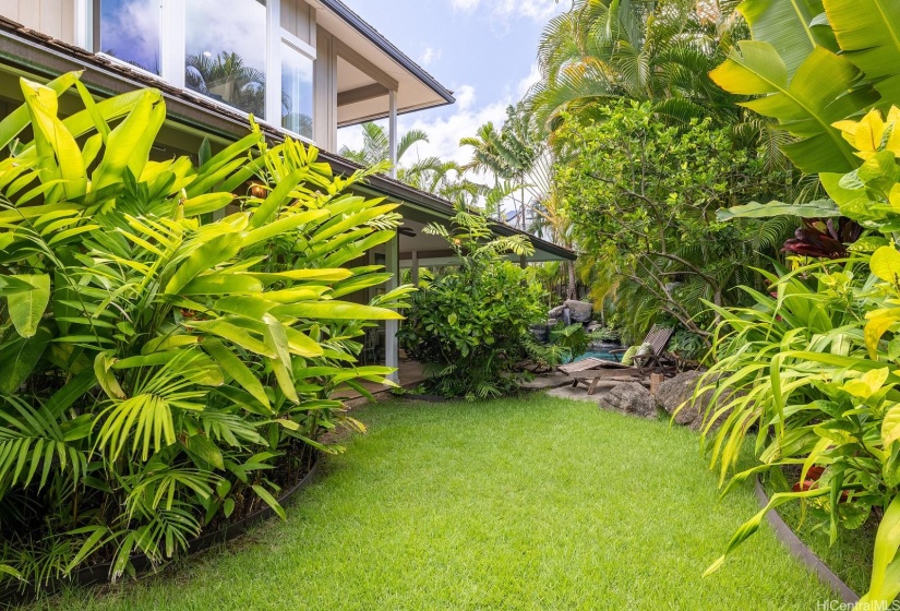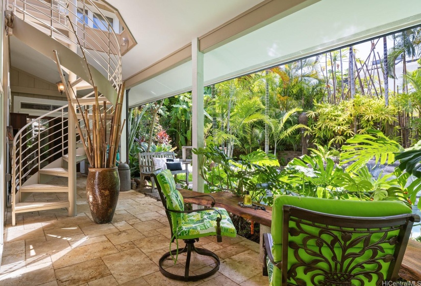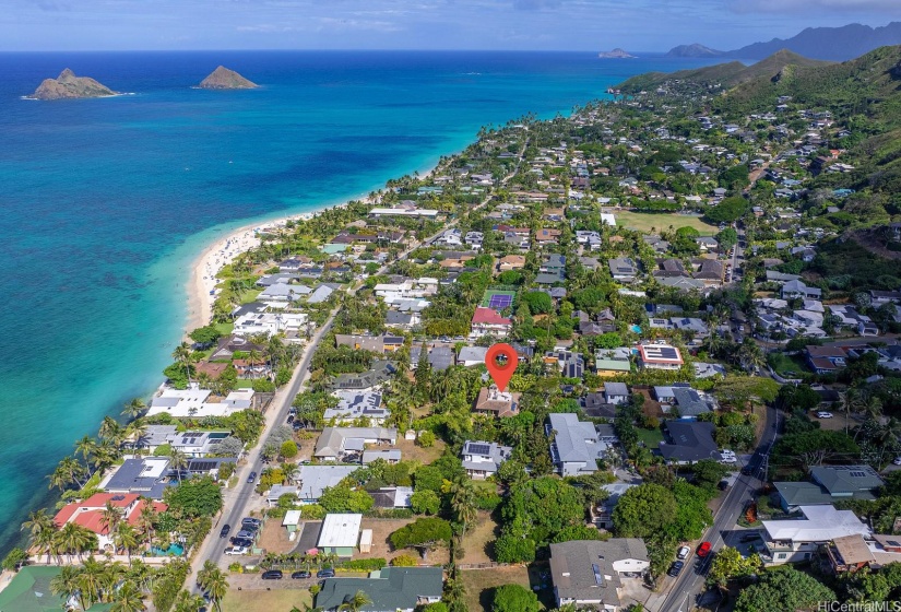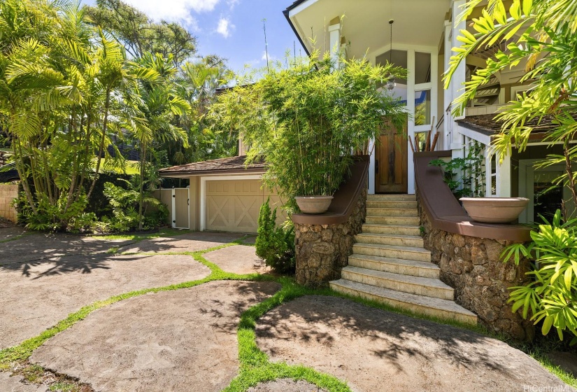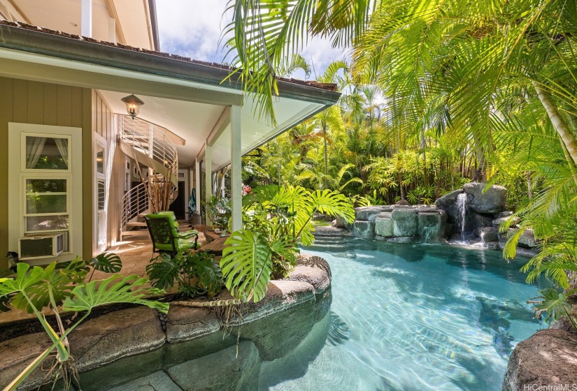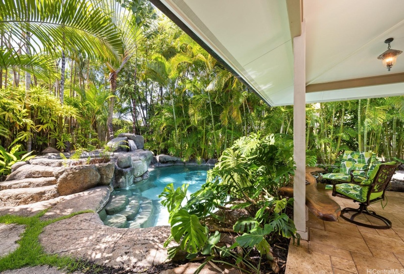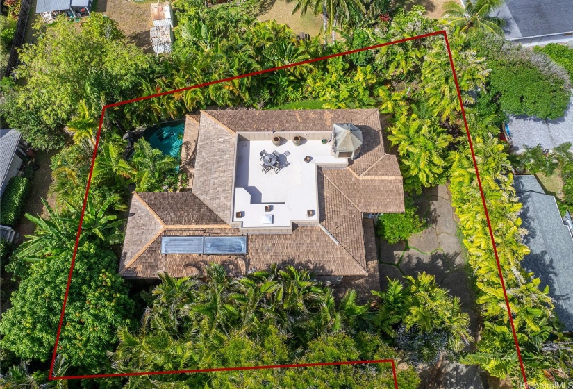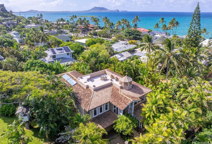 LANIKAI OASIS Secretly nestled at the start of Lanikai, this architectural accomplishment sits amidst a canopy of tropical treetops. The main living level greets you with vaulted ceilings and walls made of doors and windows that disappear so you feel as if you are in a treehouse. A stately office & powder room join this main level along with a formal dining room, eat-in kitchen, & spacious living room w/2 covered lanais. A spiral staircase leads to a rooftop deck with views of the ocean. Another staircase leads down to a pool & spa w/waterfalls in the jungle. Downstairs, 3/2 + 2-car garage. Primary suite offers a walk-in closet & French doors to a private lanai. Every room connects to covered wrap-around lanai, even the bathrooms.rnrnAmidst the mature landscape, a grassy open area for kids and pets to play. This home was made to breathe with clerestory windows both indoors and out, leaving you feeling more connected to the land and nature. Many custom details and quality materials were used to create this timeless Hawaii estate. Just 1 block to the nearest beach entrance, 1 block to Mid-Pac, and 2 blocks to both Lanikai & Kailua Beach Parks, you couldn’t ask for a better location!