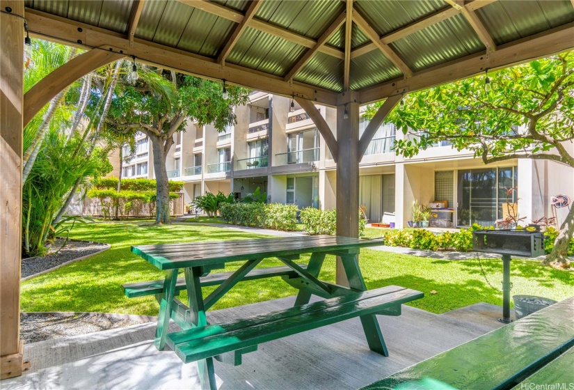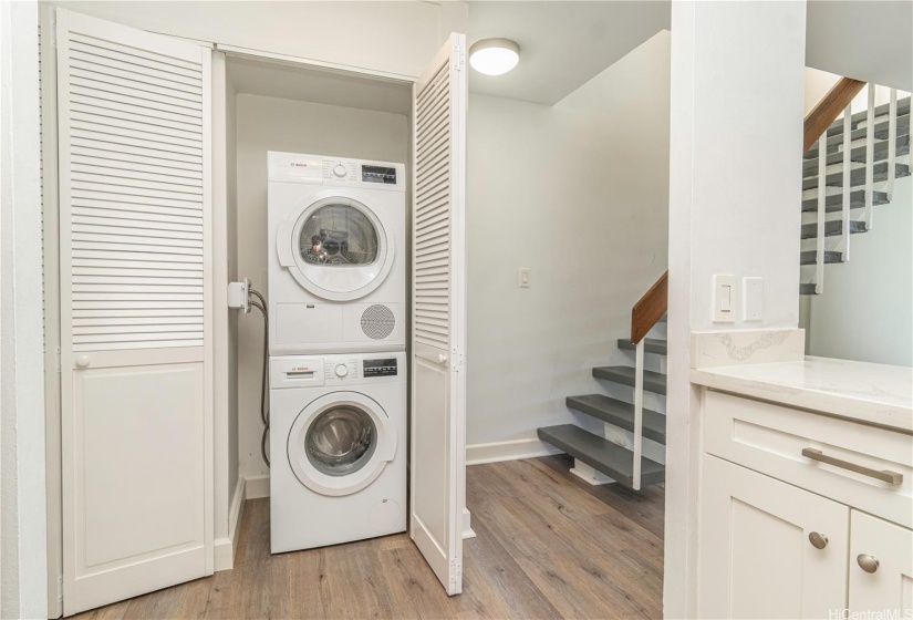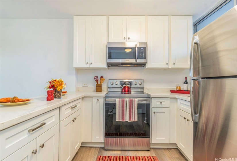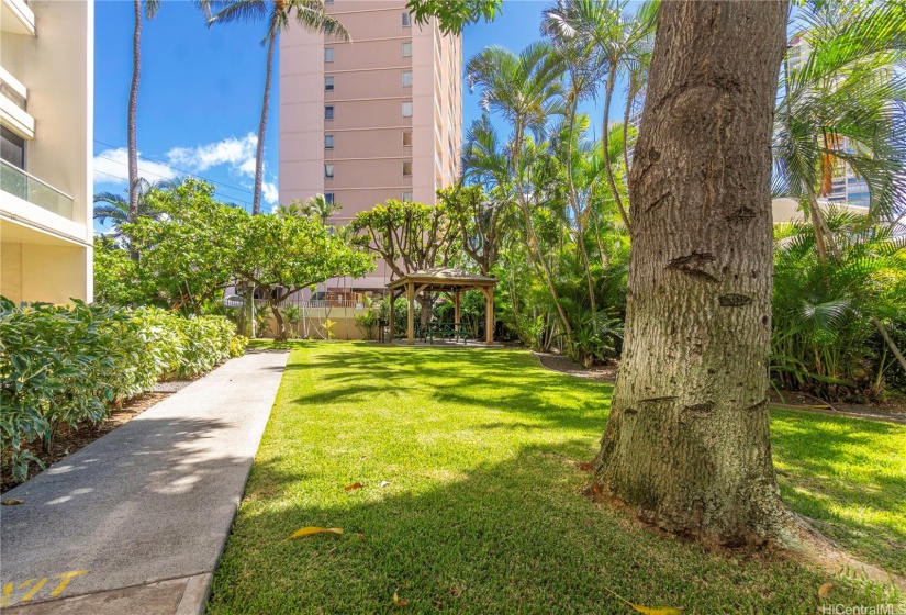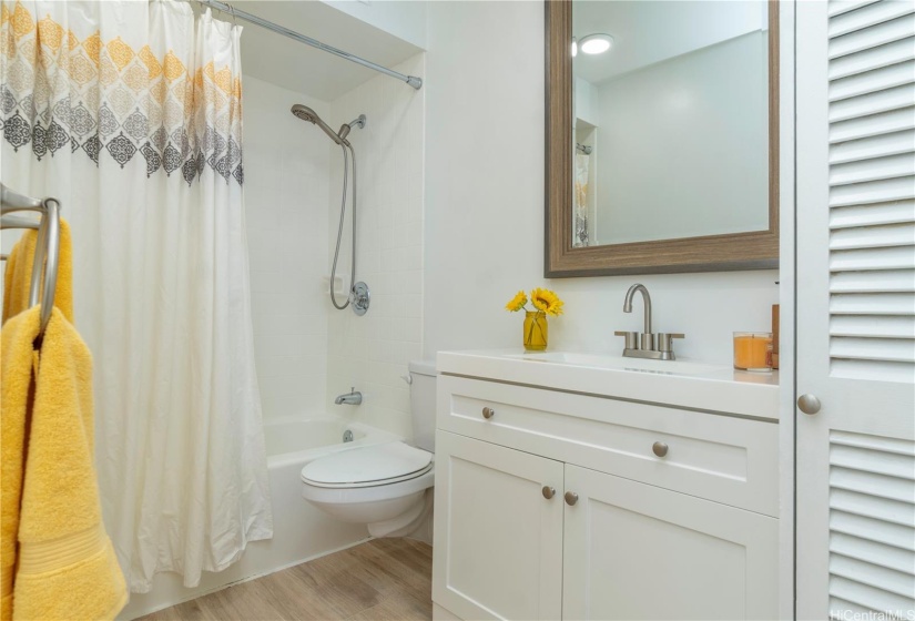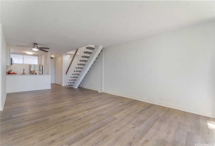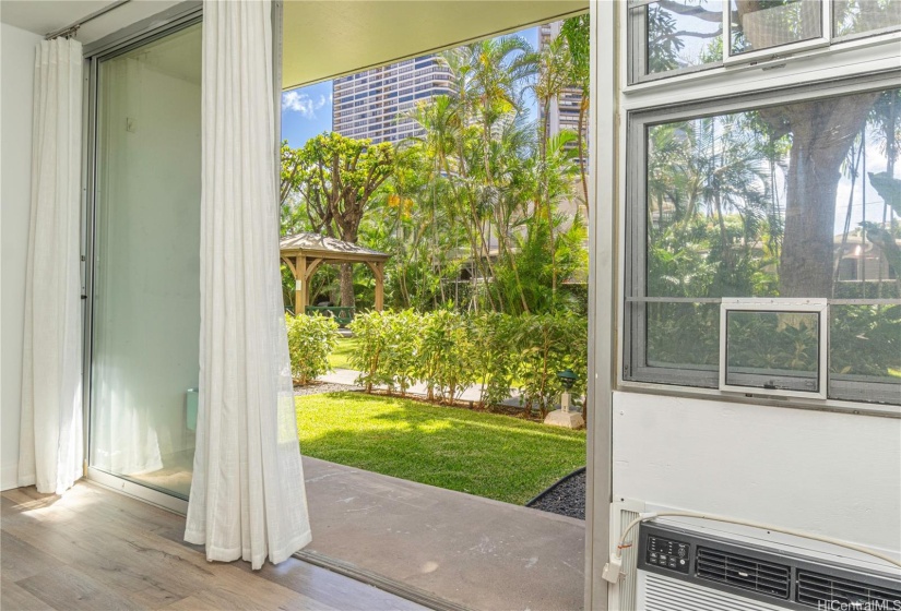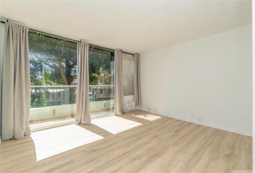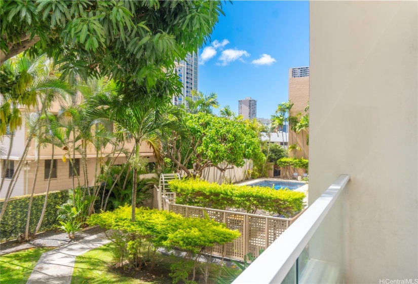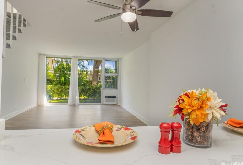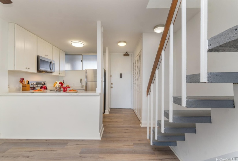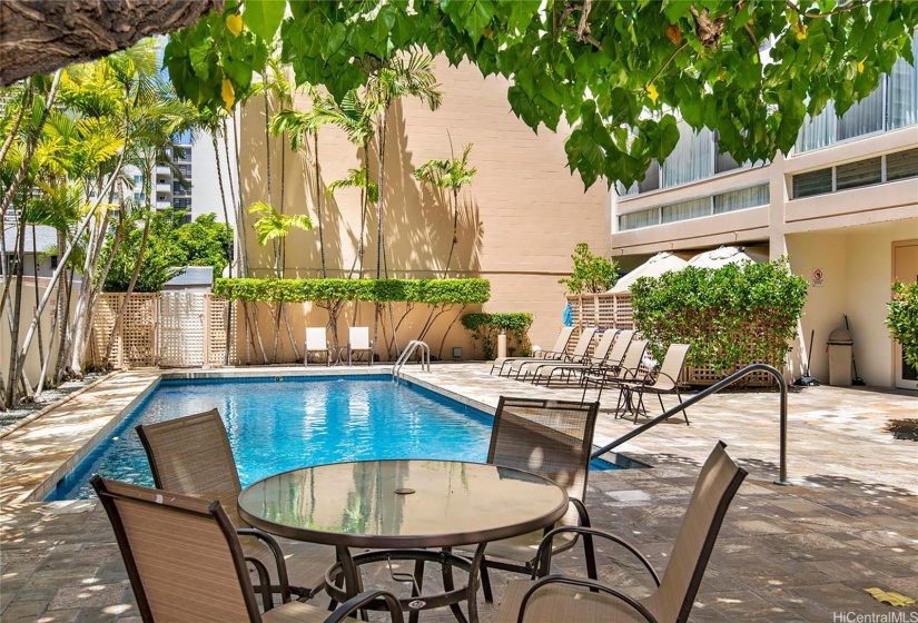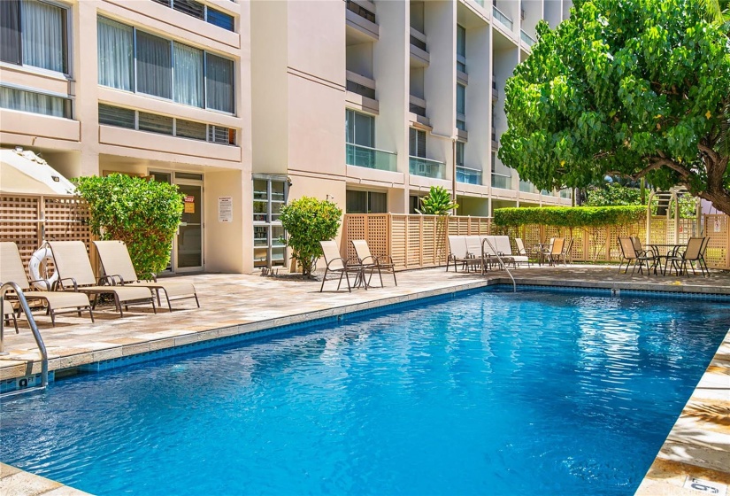 This ground floor Ala Wai Plaza Skyrise condo has brand new luxury vinyl plank flooring downstairs and new paint throughout! Enter the split level unit on the ground floor into the renovated kitchen area featuring stainless appliances. Newer, large-size washer dryer in the entry area. Walk upstairs to the 1 bedroom and bathroom. The bedroom also has luxury vinyl plank floors and another lanai off the bedroom overlooks the grounds. A new dripless window AC in the bedroom, and another powerful AC cools the ground level. From the ground floor living room and lanai you can walk out to the pool deck and grounds like it’s your back yard! This secure, well-managed building has two guest parking areas (to the left of lobby entrance, and street level of garage). The assigned stall for the unit is on the 4th floor of parking garage. Shared but not deeded storage available in building. HOA fee includes water, sewer, hot water, cable, internet, trash, and common area maintenance. Convenient location in the heart of town – easy access to buslines, the H-1 freeway, the University of Hawaii campus, Waikiki, Ala Moana, and Kapahulu shops and restaurants. One or more photos have been enhanced.