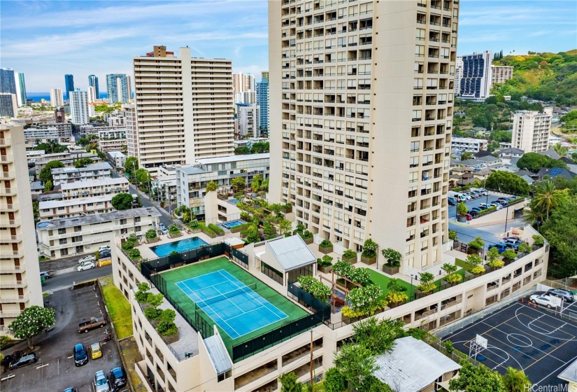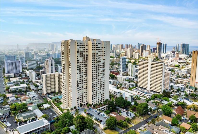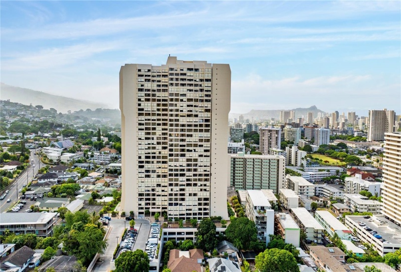 Come home to your high floor sanctuary with views of Punchbowl and the ocean! Enjoy the cool side of the building with refreshing breezes from the large lanai, while sipping your morning brew! Mott Smith boasts a gorgeous, renovated recreation deck with an infinity edged pool, jacuzzi, kiddie pool, tennis courts, individual bbq areas, a party room & green open spaces. There’s a washer/dryer in the unit, central AC, a covered parking spot, lots of guest parking and close proximity to public transportation.***Open House Saturday November 16 from 2-5pm***