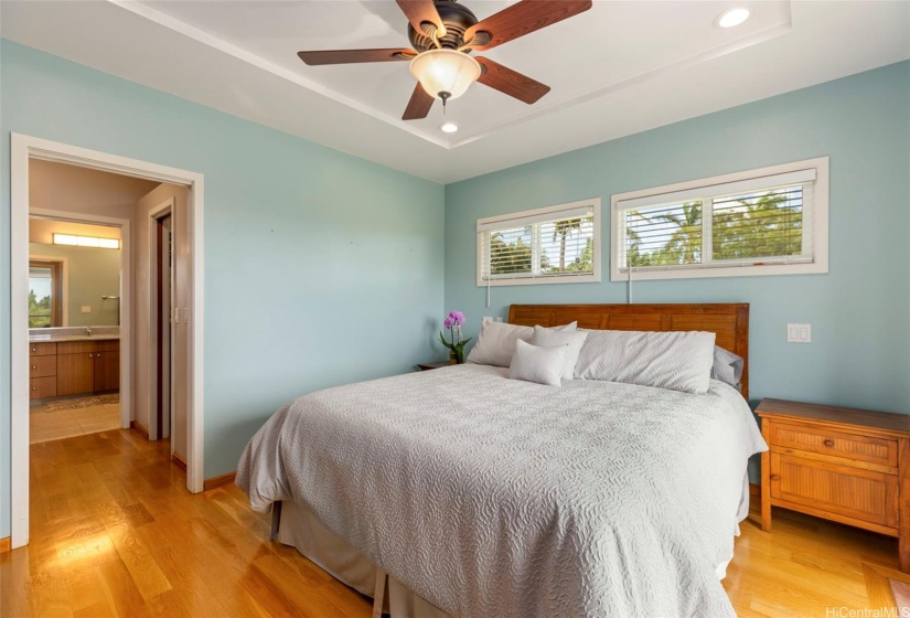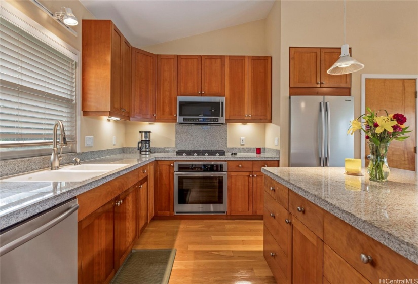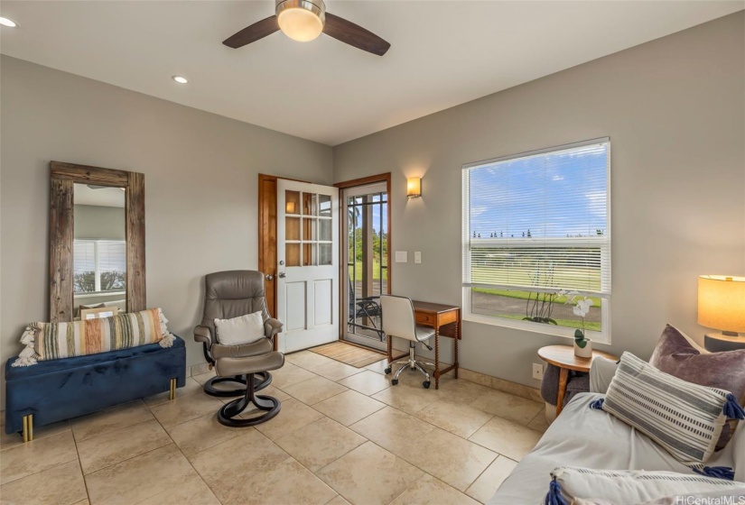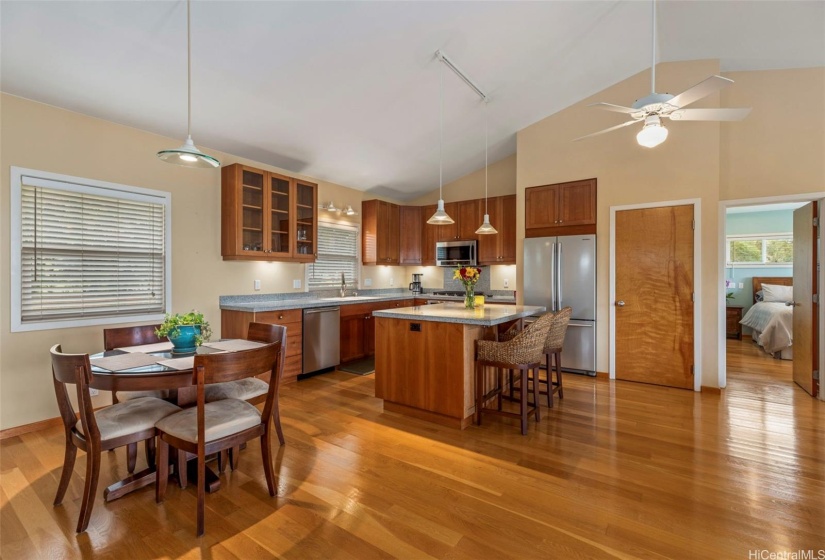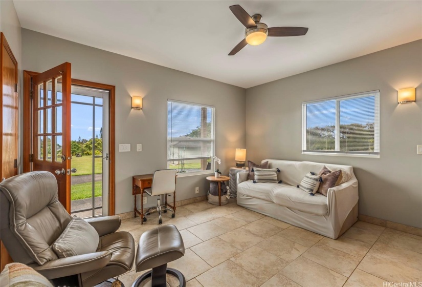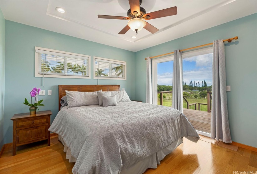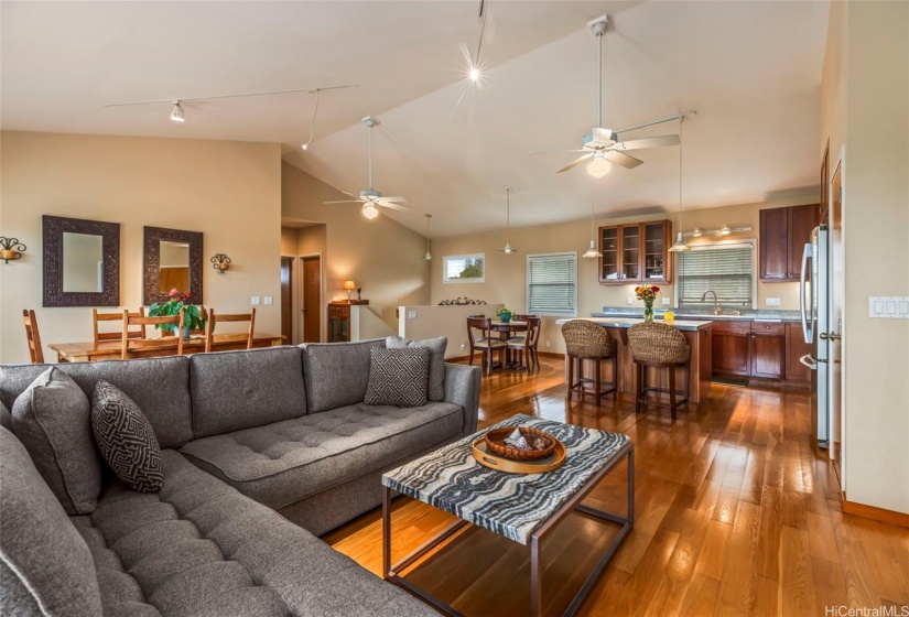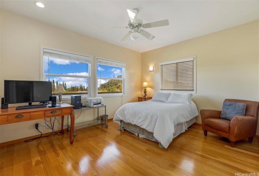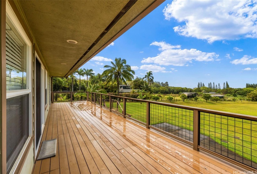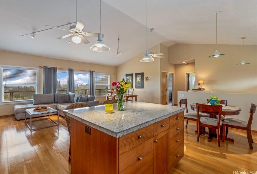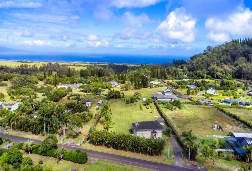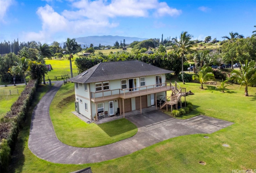 Nestled just across from Giggle Hill and the Park in Haiku, this stunning property offers the perfect blend of country living and modern conveniences. Set on over 2 acres of flat useable land, the property boasts a variety of fruit trees (tangerine, orange, lemon, lime, mango, & grapefruit) and exotic palms, creating a peaceful natural setting. The enchanting lanai runs the length of the home and is a serene space to relax and take the views of Giggle Hill, the ocean, and the west Maui mountains. The upper level features a great room with warm wood floors, a kitchen with granite tile counters, wood cabinets, gas cooking, an island, and a breakfast nook. There is also a large dining area and a spacious living room. The three upper bedrooms include a primary suite with views, a walk-in closet, and an adjoining bath with a large shower. The 4th bedroom is on the lower level, perfect for different living situations or a guest suite. Additional highlights are the garage with a work bench and a storage room with a front-load washer/dryer. The room for all the tools is in the separate agricultural shed. There is room for a cottage.