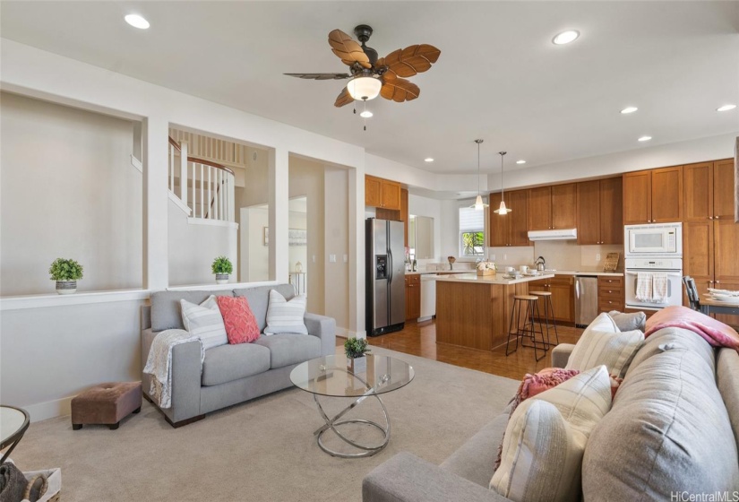 **BACK ON MARKET! SELLER OFFERING $24,000 CREDIT FOR INETREST RATE BUY-DOWN/CLOSING CLOST**Welcome to the Haleakea community! This stunning 3,100 interior sq.ft. residence beautifully combines luxury, comfort, and modern convenience. As you step inside, you’ll be greeted by high ceilings and an airy, open-concept design that floods the space with natural light. The enclosed patio has been elegantly transformed into a dining room; the spacious kitchen features a large island; and upstairs, you’ll find a media room pre-wired with built-in speakers. The versatile floor plan includes a ground-floor bedroom and full bath, perfect for guests. Retreat to the owner’s suite, which boasts a generous bedroom, walk-in closet, and a private balcony for ultimate relaxation. Enjoy outdoor living with a covered patio and a charming front porch, perfect for BBQs and alfresco dining. This home is equipped with modern amenities, including plantation shutters, California closets, a solar hot water heater, and a 36-panel PV system to help lower energy costs. Conveniently located near Laulani Shopping Center, Ka Makana Ali‘i Mall, and more! *AS-IS, PRICED BELOW ASSESSED VALUE!!