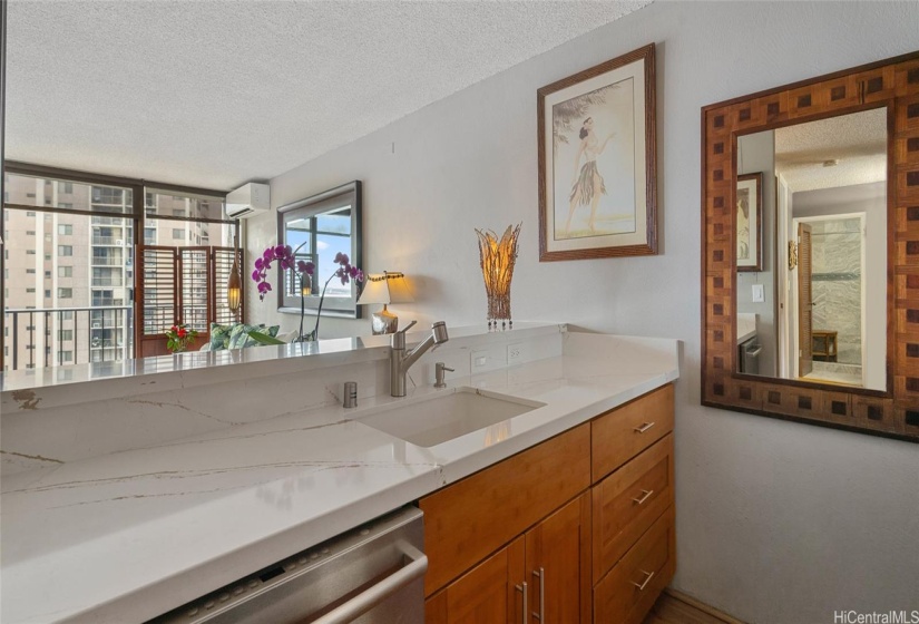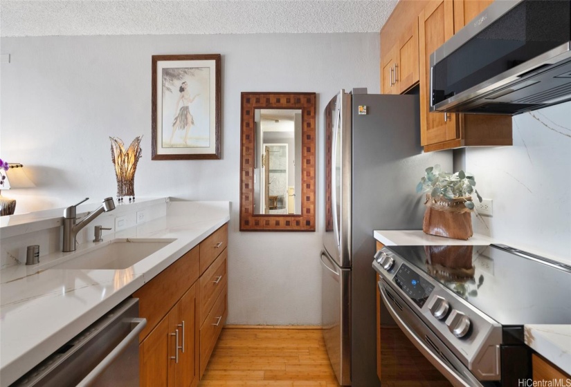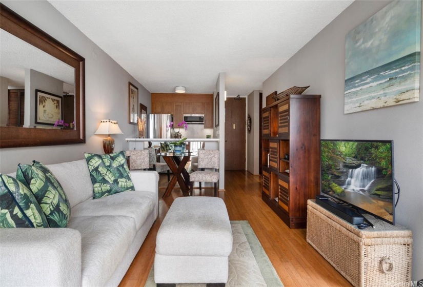 NEW PRICE ! Open Sunday Dec 1 from 2-5pm. Welcome to Pearl 1 located in the Pearlridge/Pearl City area on the island of Oahu. This property is centrally located, near everything, and convenient to shopping, hospital, and entertainment. Unit 11K is thoughtfully upgraded throughout. Kitchen boasts steel appliances with an induction stove, quartz counters, beautiful custom cabinetry and a bar counter. Living space features bamboo flooring, gorgeous west facing views and access to the large covered lanai with room for table and chairs. Enjoy the sunsets from the extra outdoor living. The bedroom has a huge closet and sliding door access to the lanai. The bathroom has quartz counters with dual sinks and a stone step-in shower. Furnishings are negotiable. Pets are not allowed. Other bonuses include 2 newly installed split Air Conditioners, front loading washer/dryer, covered secure parking, storage space, swimming pool and pickleball/basketball court. Enjoy life at Pearl 1.