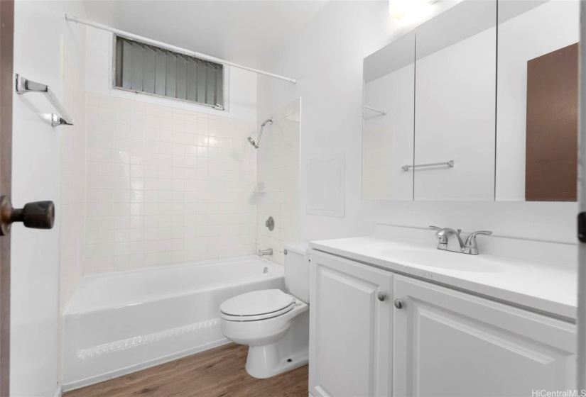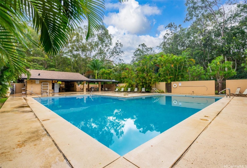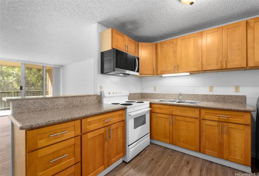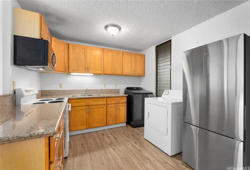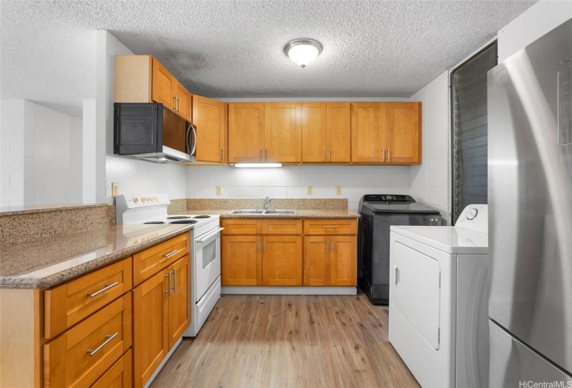Enjoy serene garden views from this beautifully updated 2-bedroom, 1-bathroom oasis in Building D of Waikalani Woodlands. Modern updates include granite countertops, vinyl plank flooring, a new microwave hood, water heater, main shut-off valve, and a freshly resurfaced bathtub. The in-unit washer and dryer were both replaced within the last five years, and the refrigerator is only three years old. Over the past years, new kitchen cabinets, a bathroom vanity, and all sinks have been updated as well. This pet-friendly unit offers two designated parking spaces, plus ample guest parking. Community amenities include a large park, pool, and BBQ areas. Conveniently located near shopping, dining, entertainment, and outdoor activities, Waikalani Woodlands offers the perfect blend of nature and convenience. (Some photos are enhanced)