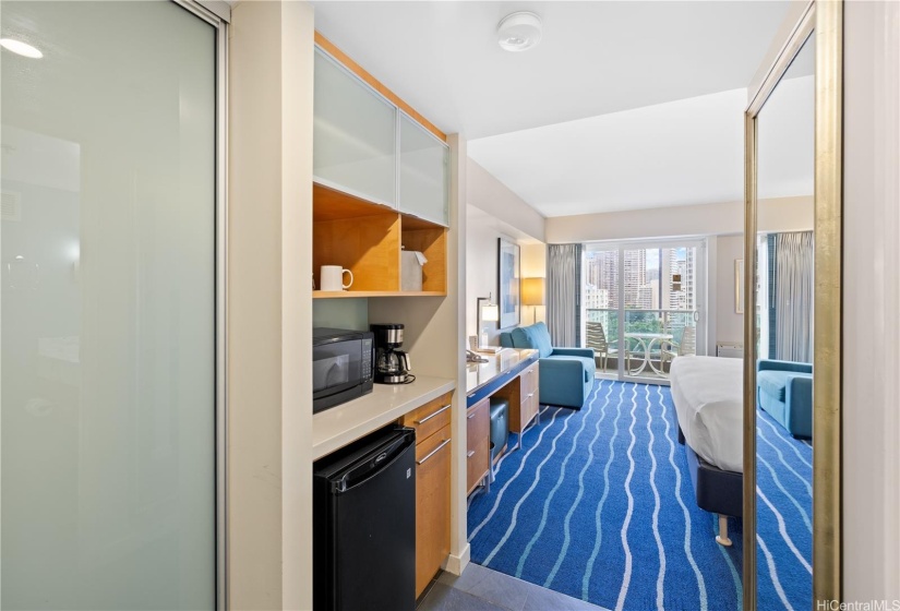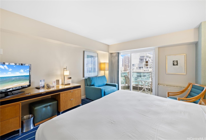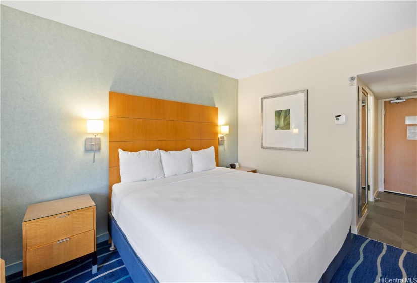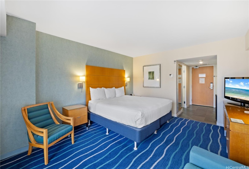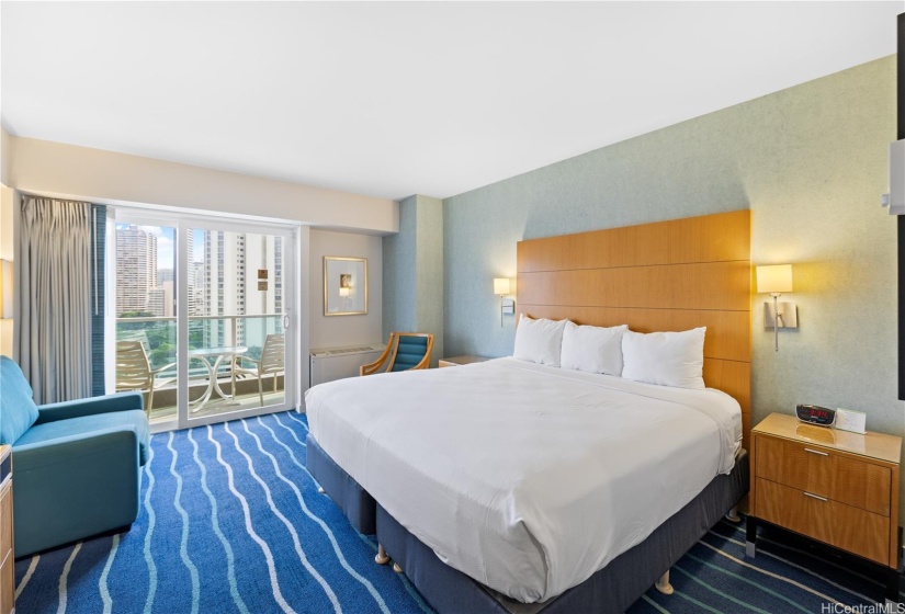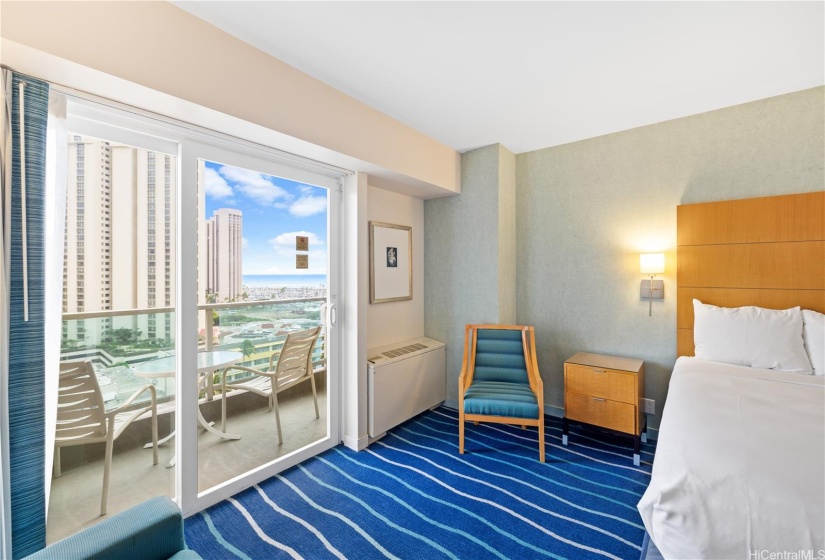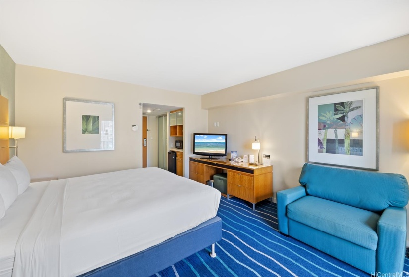 This Ala Moana Hotel Condo unit is in a prime location near Waikiki, the Convention Center, and Ala Moana Beach Park. It offers easy access to shopping, dining, and outdoor activities, with amenities like a fitness center, pool, sauna, and restaurants. The building was recently renovated in 2020 and connects directly to the Ala Moana Shopping Center. It is located in the Waikiki Tower and has a king-size bed and a sleeper chair for multiple guests.