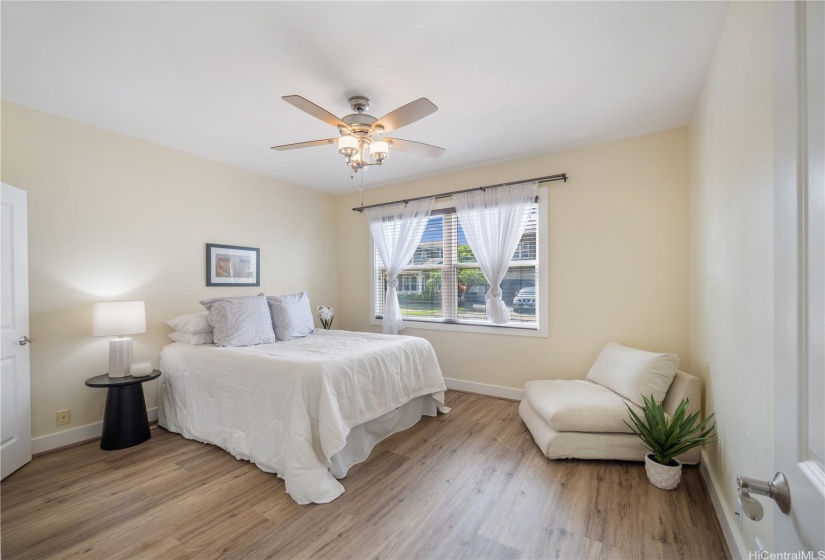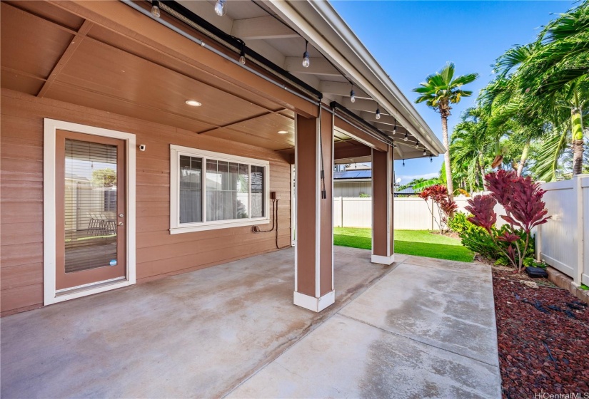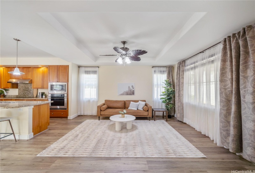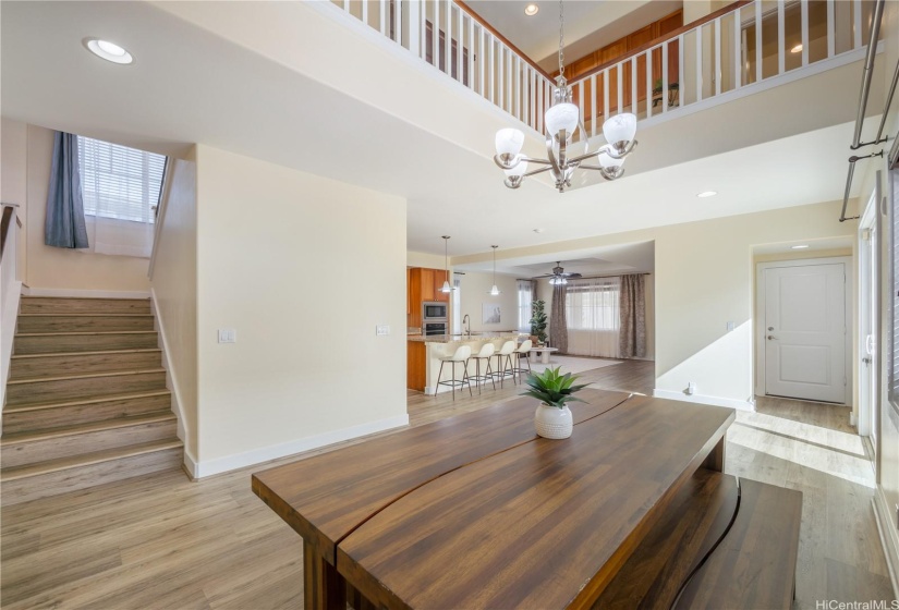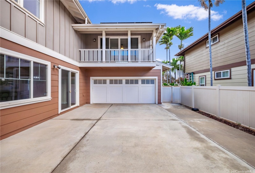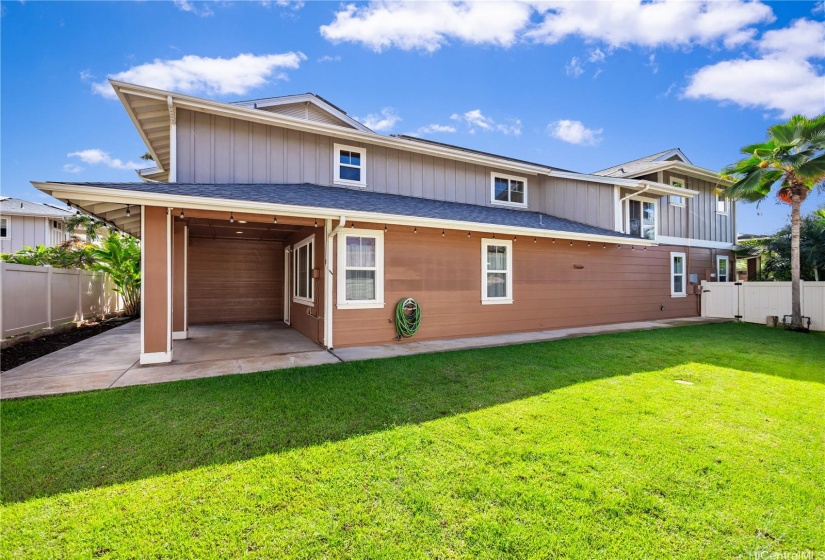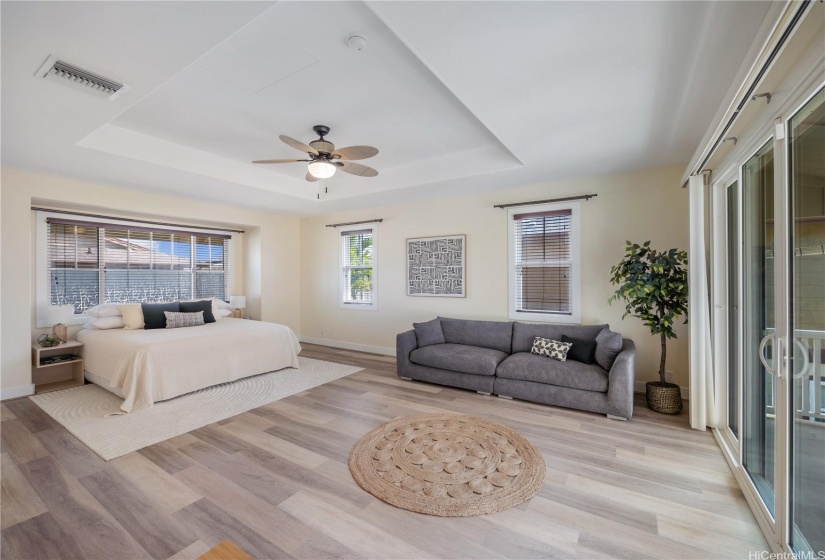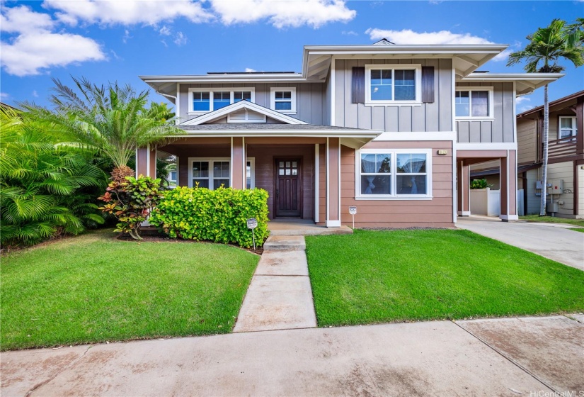 Opportunity strikes again. This hale is back on the market— no fault of the sellers! This stunning home offers a perfect blend of comfort & elegance, enhanced by upgrades including a brand new roof, 40 owned PV panels, a whole-home water filtration & softener system, & more. Step inside to find an inviting living area with soaring ceilings & an abundance of natural light, creating a bright & airy ambiance. The dedicated dining area flows seamlessly into the spacious kitchen, perfect for entertaining & everyday living. Beyond the kitchen lies a comfortable family room. On the main level, you’ll find a bedroom & full bath, offering flexibility for guests, in-laws, or multi-generational living. Head upstairs to discover the expansive primary suite—a true retreat with a spacious en-suite featuring a soaking tub, walk-in shower, & walk-in closet. The laundry room upstairs adds ease to daily living. Step out to the lanai at the back of the home, where you can enjoy fresh breezes & relax in your private, grassy yard. A wide driveway leads up to the large garage, designed to fit trucks or SUVs comfortably & equipped with an EV charging plug. Don’t miss your chance to make this home yours!