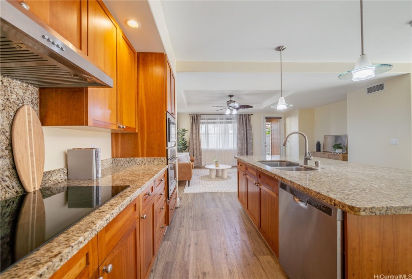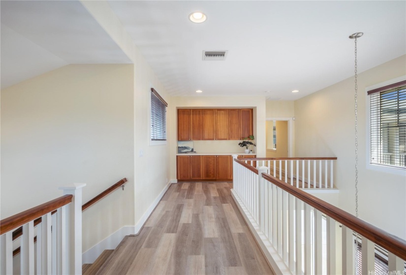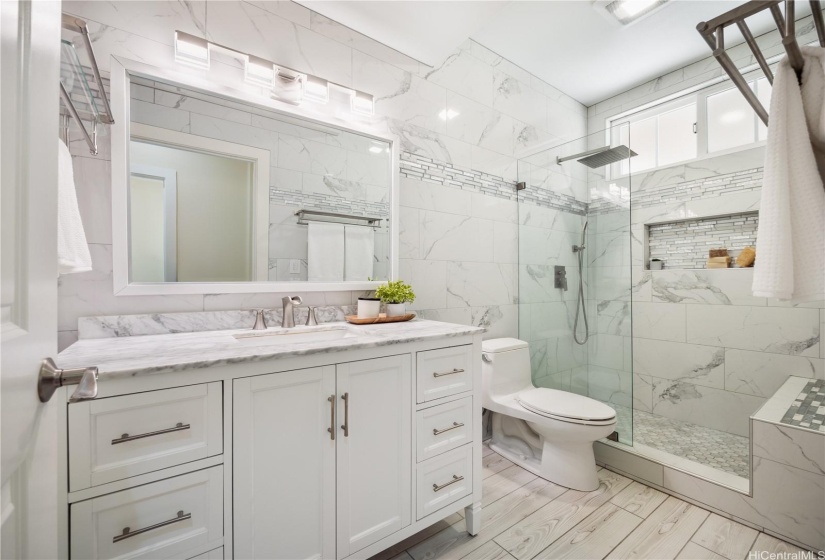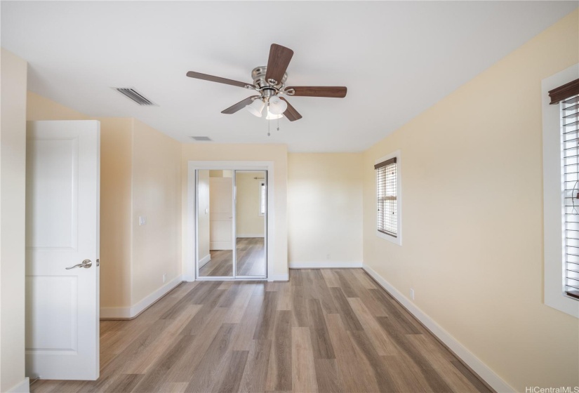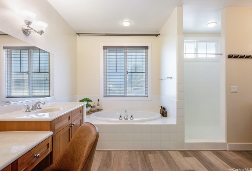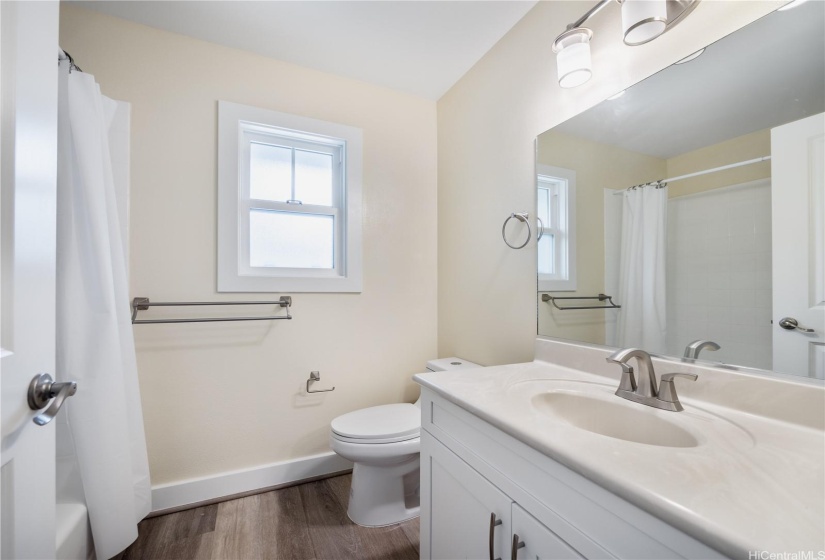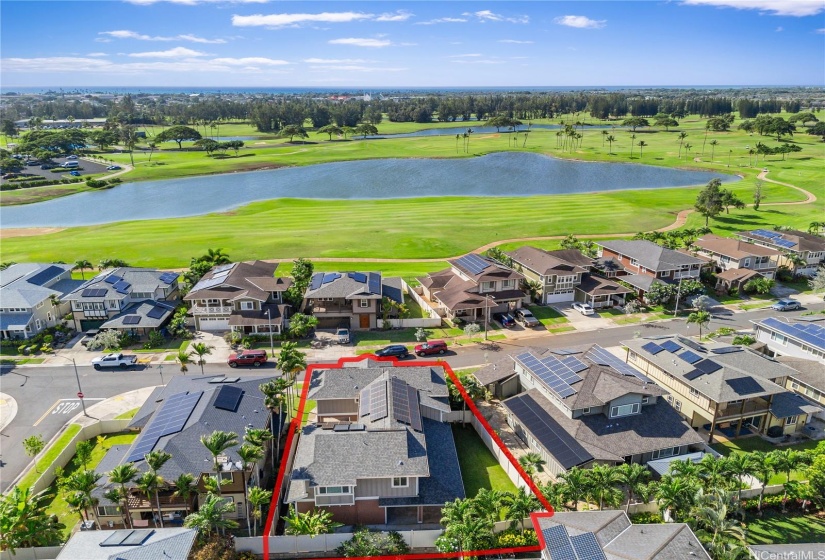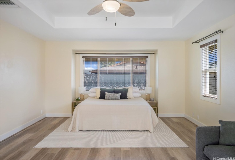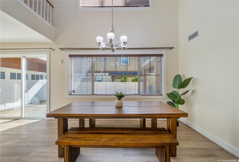 Opportunity strikes again. This hale is back on the market— no fault of the sellers! This stunning home offers a perfect blend of comfort & elegance, enhanced by upgrades including a brand new roof, 40 owned PV panels, a whole-home water filtration & softener system, & more. Step inside to find an inviting living area with soaring ceilings & an abundance of natural light, creating a bright & airy ambiance. The dedicated dining area flows seamlessly into the spacious kitchen, perfect for entertaining & everyday living. Beyond the kitchen lies a comfortable family room. On the main level, you’ll find a bedroom & full bath, offering flexibility for guests, in-laws, or multi-generational living. Head upstairs to discover the expansive primary suite—a true retreat with a spacious en-suite featuring a soaking tub, walk-in shower, & walk-in closet. The laundry room upstairs adds ease to daily living. Step out to the lanai at the back of the home, where you can enjoy fresh breezes & relax in your private, grassy yard. A wide driveway leads up to the large garage, designed to fit trucks or SUVs comfortably & equipped with an EV charging plug. Don’t miss your chance to make this home yours!
