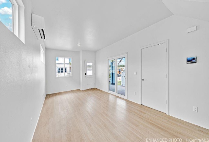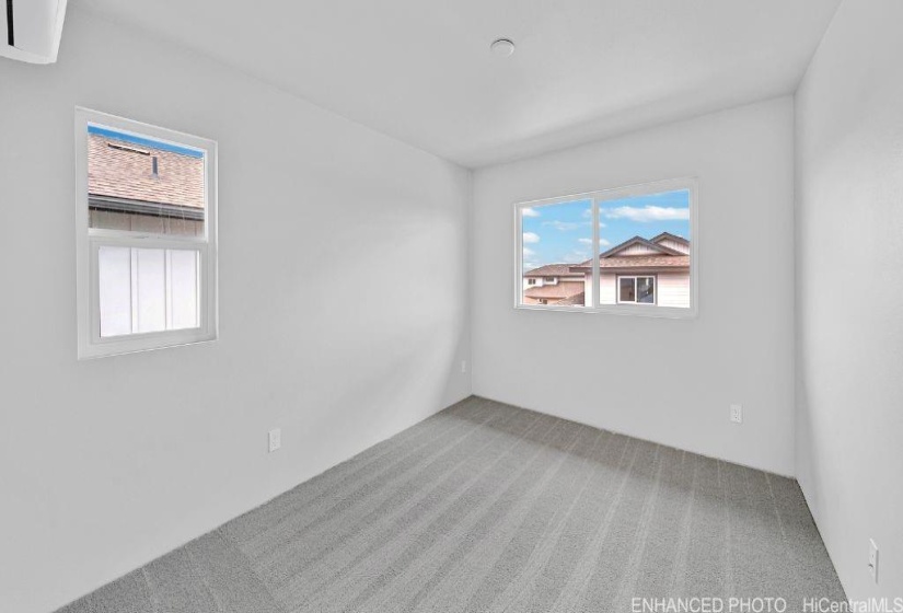 The ‘Moon’ or Mahina plan. The first floor living area is a spacious design that includes the living room, dining room, kitchen, powder room, bulk storage/safe room, and additional under stairs storage. The modern-style kitchen with white cabinets provides ample storage space, soft-close doors, and drawers, and features a Kohler single-basin vault sink, as well as a Whirlpool® SS appliance package. The spacious second floor primary suite has a walk-in closet and bath with dual sinks and a step-in shower. The secondary bedrooms are light and have mirrored wardrobes. For your convenience, the hallway includes solar tube lighting, the drop zone tech area with USB-C outlets and cabinets, and an enclosed laundry space with washer and dryer hookups. Enjoy features such as split ACs in the living area and bedrooms, vinyl plank flooring in the living and kitchen areas, and plush carpeting in the bedrooms. The 1-car attached garage with a 1-car tandem covered carport, has a utility sink, automatic garage door opener, and is PV and EV ready. A 10-year Limited Structural Warranty, Urban Garden with automatic irrigation, and a Home is Connected® smart home system is also included in this home.