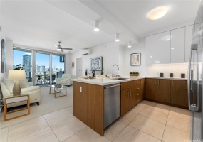 This is a fully furnished and remodeled B unit, with every room having ocean views. High quality finishes were used in the remodel, including the flooring and tile work. Uraku tower units have one of the larger open lanais in Kakaako with clear ocean views.